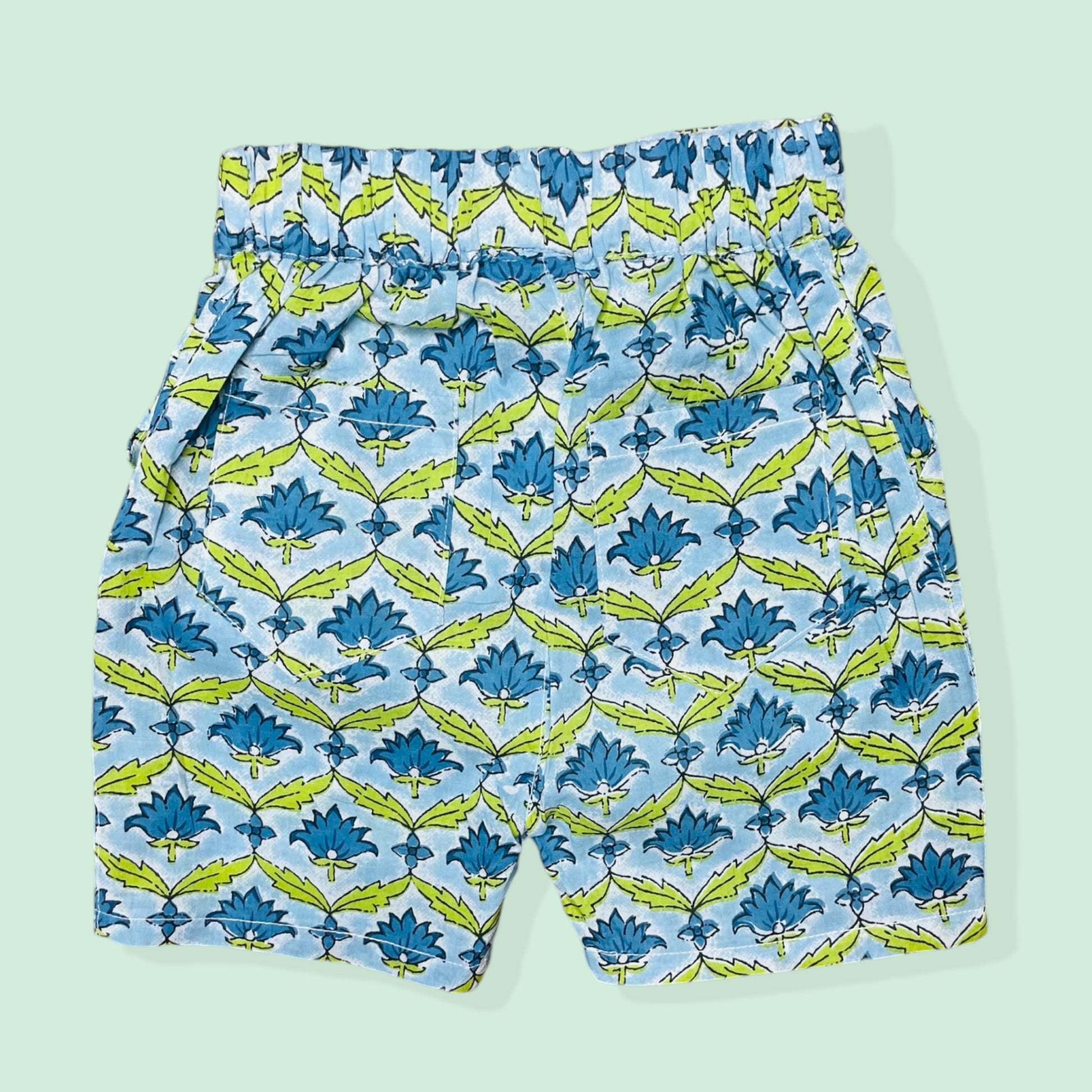 The Azure Breeze Shorts are a stylish choice for young adventurers. Featuring a vibrant blue fabric adorned with playful green leaf motifs, these shorts are crafted using traditional handblock printing techniques. Made from soft, pure cotton, they provide comfort and breathability for all-day wear.