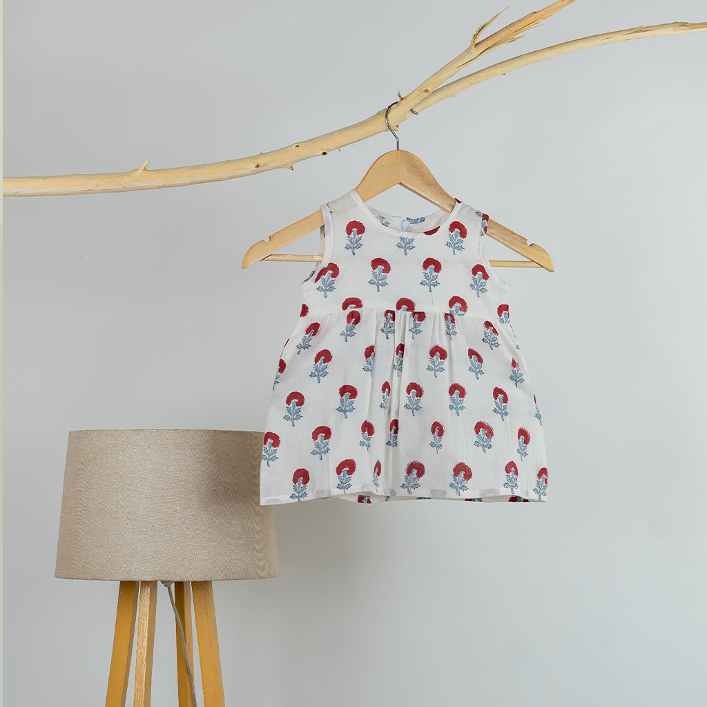 The Cherry Bloom Dress is a vibrant celebration of color and comfort. Featuring bold red floral motifs on a fresh white base, this sleeveless dress is crafted from pure cotton - perfect for sunny days and spirited adventures.